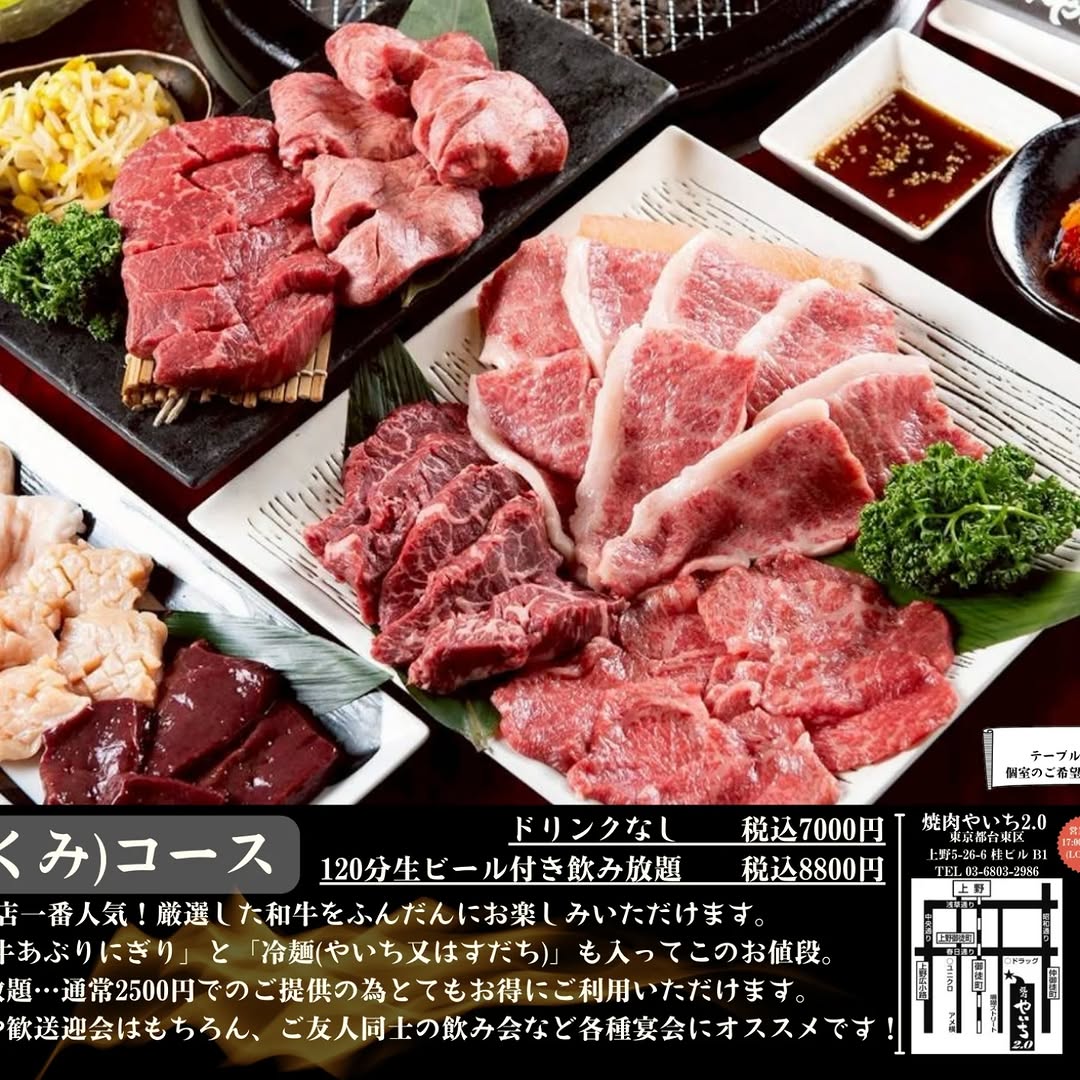 に投稿されました 佳織 Trustindex は、レビューの元のソースが Google であることを確認します。 お肉も美味しかったですし、店員さんの接客もとても良かったです! に投稿されました uncon. TV Trustindex は、レビューの元のソースが Google であることを確認します。 店人気No.1匠(たくみ)コースをいただきました☺️🤍 とーーっても美味しくて最高でした😆✨ お肉の質が良くて どの部位も本当に美味しかった〜〜〜!!!😭✨ 質も良いのに、ボリュームも凄くて お腹いっぱい、大大大大満足🥹✨✨✨ ホルモンもA5和牛サーロイン炙りにぎりも 〆の冷麺も本当に美味しかった〜〜😳🤍 ごちそうさまでした!☺️🙏🏻 に投稿されました コトノハのグルメ Trustindex は、レビューの元のソースが Google であることを確認します。 厚切り角タン塩と、あか牛の特選厚切りロースは、その厚みに思わず驚かされます。しっかりとした食べ応えがありながら、火入れによって柔らかさもあり、肉の旨みをダイレクトに楽しめました。 和牛サーロイン炙りにぎりは、口に入れた瞬間に脂の甘みが広がる贅沢な一貫。黒毛和牛カルビはジューシーで、ご飯が欲しくなる王道の美味しさです。 あか牛炙り3秒ロースはさっと炙ることで赤身の旨みが際立ち、にんにくハラミはパンチのある味付けで良いアクセントに。ホルモン3種盛りも下処理が丁寧で、食感と旨みのバランスが良好でした。 〆はやいち冷麺、またはすだち冷麺から選択。自家製和牛出汁を使ったさっぱりとした味わいで、お酢を加えることでさらに爽快感が増し、食後でも重くなりません。 デザートの生チョコアイスまで含め、満足度の高い内容。隠れ家的な雰囲気の落ち着いた空間で、歓送迎会などの集まりにも使いやすいお店だと感じました。 に投稿されました Charbel Abou Haidar Trustindex は、レビューの元のソースが Google であることを確認します。 Very convenient, it stays open till late. I went there at 11 pm and it was really quiet. I enjoyed the meat set provided. I highly recommend に投稿されました ひとみ Trustindex は、レビューの元のソースが Google であることを確認します。 御徒町駅徒歩2分ほどのところにある【焼肉やいち2.0】さんにお邪魔しました🥰 お店にはサインがいっぱい✨❣️ 匠コースをいただきました🤤🩷 キムチ ナムル やいちサラダ 厚切り角タン塩 あか牛特選厚切りロース 和牛カルビ あか牛炙り3秒ロース ニンニクハラミ A5和牛サーロイン炙りにぎり 厳選ホルモン3種盛 名物やいち冷麺 本日のアイス 大満足のラインナップ👏💕 厚切り角タン塩は分厚くて、しっかり焼いても柔らかくてとろける味わい😭✨ 厚切りロースは、ほぼステーキ! 柔らかくてさっぱりしてる🤤 和牛カルビは程よく脂があって、柔らかくて美味しい😋 3秒ロースは、、衝撃!! ロースなので脂がほぼないのに柔らかくてさっぱりとしてて口の中から無くなる🫢 何枚でも食べれちゃう😂 にんにくハラミはニンニクガツンと、ハラミの柔らかさで幸せ💕 サーロイン炙り握りは、、とろける〜😭💕これは感動😍 ホルモンは上ミノはサクッと食べれて、新鮮さがすごい👏💛 シマチョウは脂がブリンブリンでこれまた美味😋✨ やいち冷麺とスダチ冷麺をチョイス🤤 さっぱりしてて、食べやすくてスープもおいしい😋 どれも美味しくて、ずっと最高に幸せでした👏💕 匠コース、お祝いやみんなでワイワイでもオススメです😋✨ ぜひ行ってみてね😊 に投稿されました キャベツ桂太郎 Trustindex は、レビューの元のソースが Google であることを確認します。 御徒町駅から徒歩3分圏内にある焼肉店 場所は地下にあります。 平日の17:00~来店しました。 比較的空いていて早い時間帯がおすすめ 遅い時間は予約をオススメします。 17:00~03:00まで営業しているみたい 今回は人気No.1コース匠コースにしました。 コース内容 ◆ナムル ◆キムチ ◆やいちサラダ ◆厚切り角タン塩 ◆あか牛特選厚切りロース ◆和牛カルビ ◆あか牛炙り3秒ロース ◆ニンニクハラミ ◆A5和牛サーロイン炙りにぎり ◆厳選ホルモン3種盛 ◆名物やいち冷麺 ◆本日のアイス 3秒ロースは両面3秒炙ってすぐ頂けます。 これ本当に美味しかった。 ニンニクハラミはニンニクが大量にのっています。 美味しいけど、次の日の事も考えて食べましょう 名物やいち冷麺はあっさりしていて お口直しにぴったり 是非食べてみてね。ご馳走さまでした。 に投稿されました Sora Aoki Trustindex は、レビューの元のソースが Google であることを確認します。 今回いただいたのは、 ■「匠」コース ¥7,000 ・ナムル盛り合わせ ・キムチ ・やいちサラダ ・厚切り角タン塩 ・あか牛特選厚切りロース ・和牛カルビ ・あか牛炙り3秒ロース ・ニンニクハラミ ・A5和牛サーロイン炙り握り ・厳選ホルモン3種盛り ・名物やいち冷麺 ・本日のアイス となっており、 画像添付してるので、 見てください🤗 焼肉のタレ自体は どちらかと言うと、 甘さは控えめで、 醤油ベース?のコク深い印